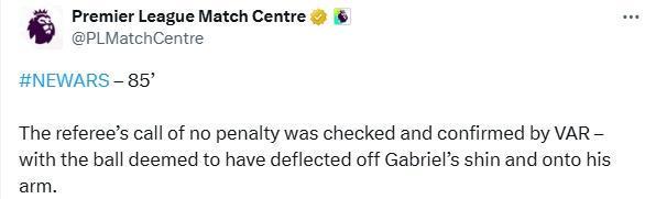 英超官方解释:“裁判不是点球的决定经过了VAR的审核和确认,球被判定从加布里埃尔的小腿上弹到了他的手臂上。”