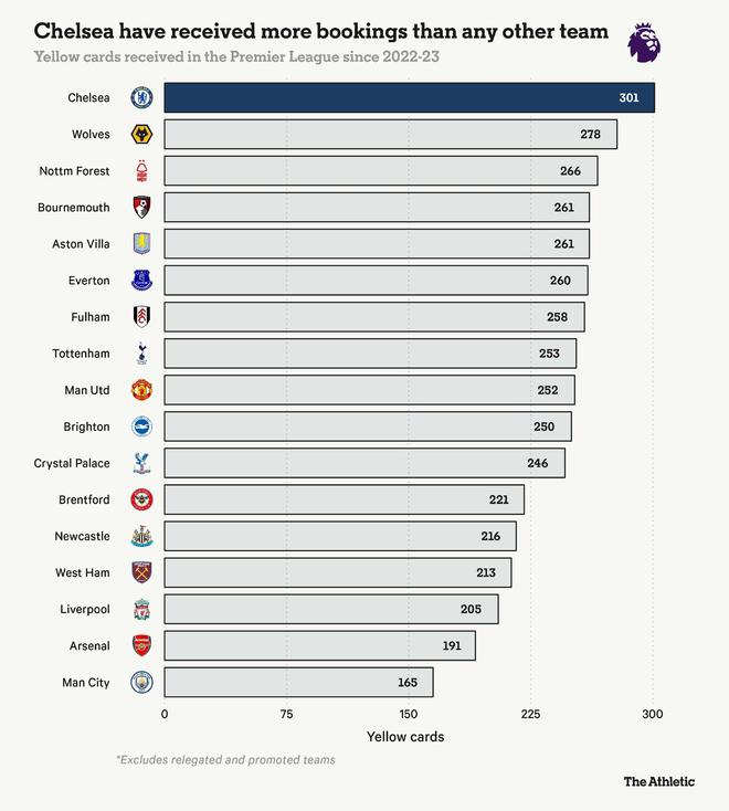 TA:切尔西自2022-23赛季以来吃到301张黄牌远超其他球队