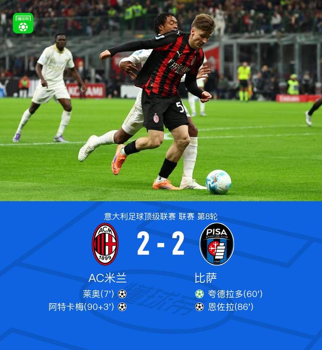北京时间10月25日意大利足球顶级联赛第8轮,AC米兰主场对阵比萨。上半场,里奇助攻莱奥内切远射破门;下半场,德温特手球送点后夸德拉多主罚命中扳平,莱奥爆射中楣,阿金桑米罗长传助攻恩佐拉逆转,补时阶段莫德里奇助攻阿特卡梅远射绝平。最终比分AC米兰 2-2 比萨。