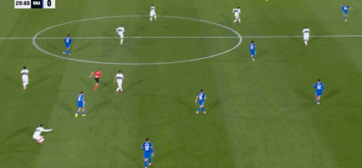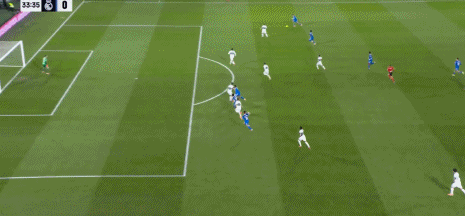 第29分钟,安德烈-席尔瓦一对一面对库尔图瓦,没有射门选择横传被破坏