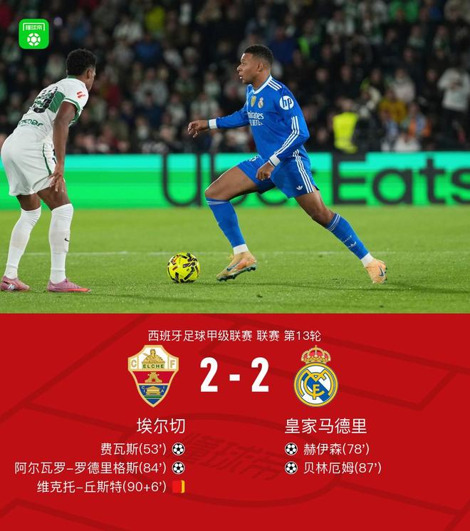 北京时间11月24日西班牙足球甲级联赛 联赛 第13轮,埃尔切主场对阵皇家马德里。上半场,两队均无建树。下半场,费瓦斯打破僵局。贝林厄姆摆渡,赫伊森扳平比分。阿尔瓦罗破门帮助主队再次领先,姆巴佩助攻,贝林厄姆再次扳平比分。全场比赛结束,皇马2-2战平埃尔切,遭遇连续三场比赛不胜。